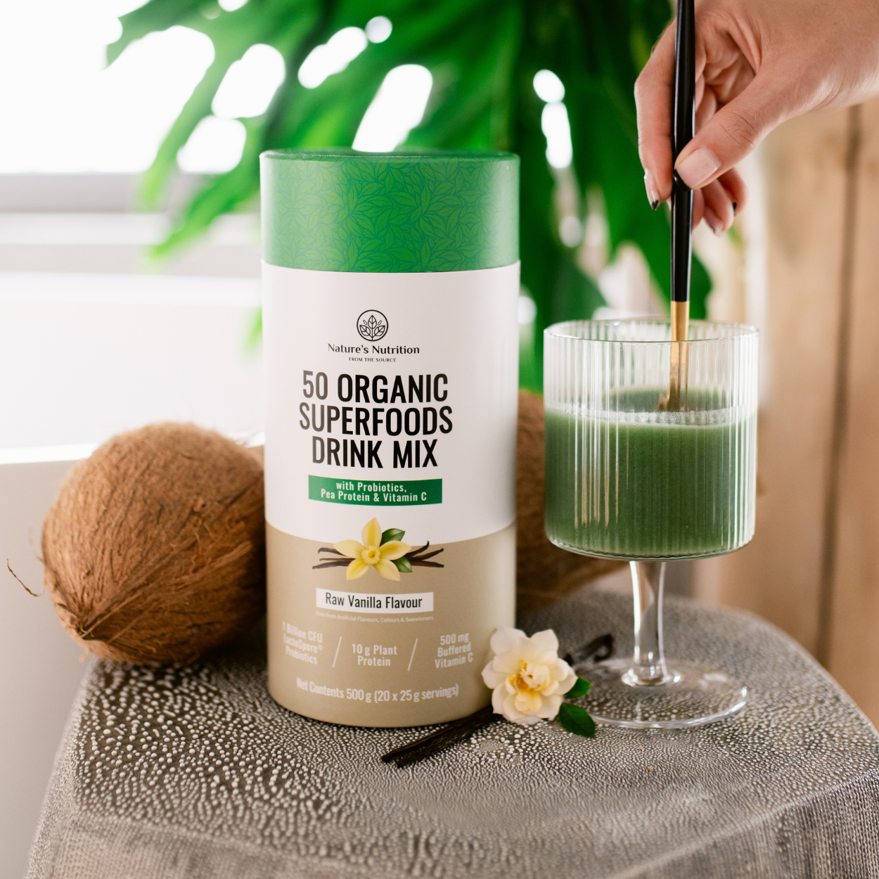 Our Nature’s Nutrition formulations provide a good supply of plant protein, vitamin C, probiotics, organic superfoods and fibre and, being low in fat and calories, our drink mixes can be used as a snack or meal replacement to support the nutritional requirements of an active healthy lifestyle. We do, however, advise against using our products as a sole source of nutrition and rather including them as part of a balanced daily eating plan.