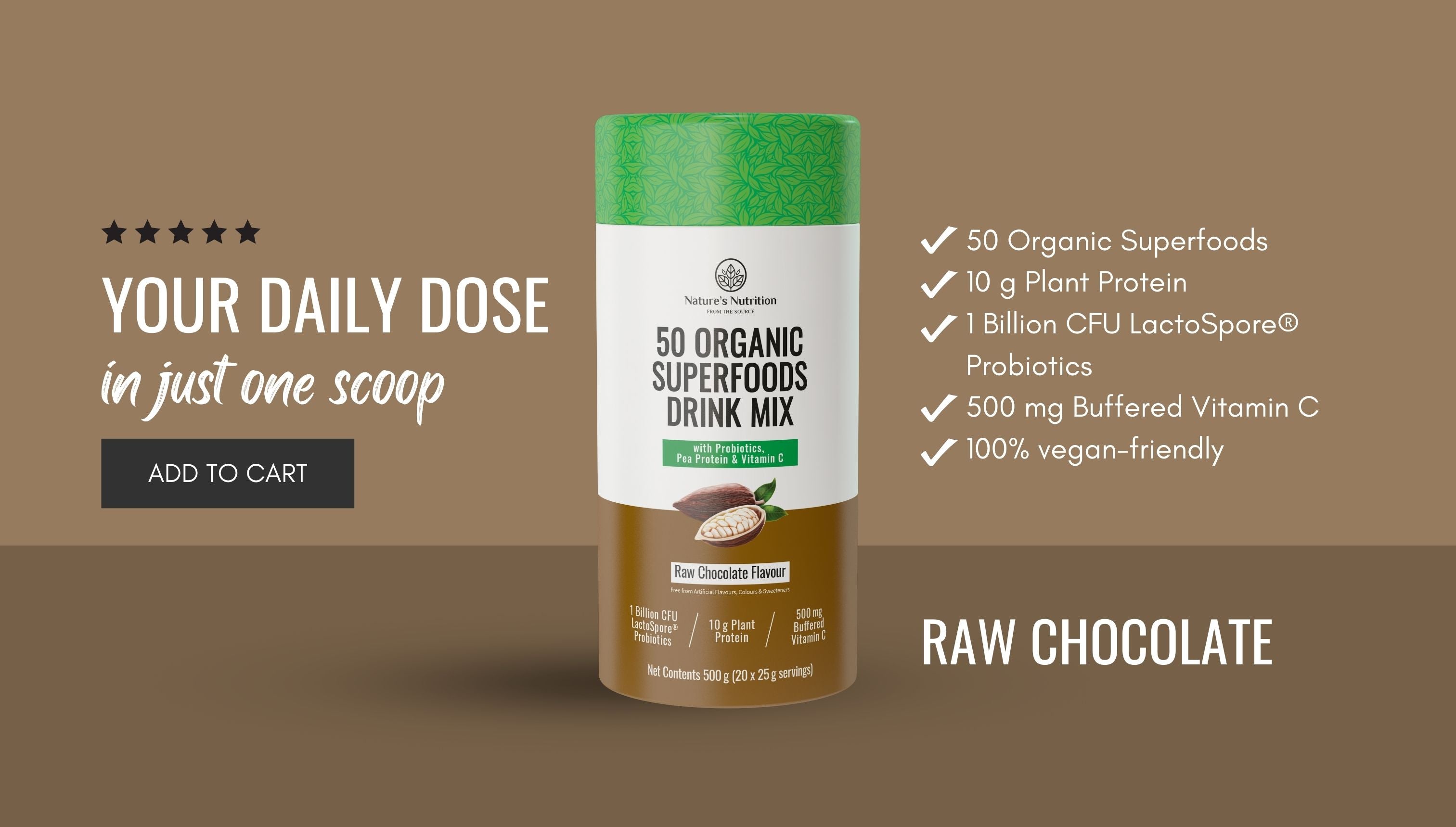 Pair your favourite 50 Organic Superfoods Drink Mix with Nature’s Nutrition Plant Protein, a highly bioavailable source of vegan protein with 15 g Complete Plant Protein (Pea and Rice) and get a FREE recipe book.