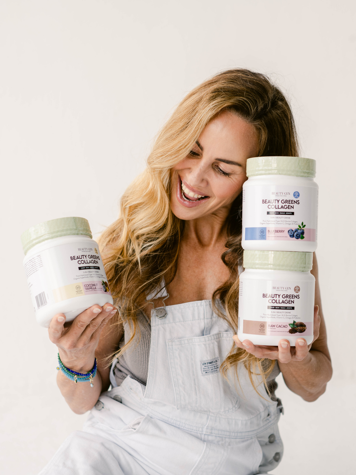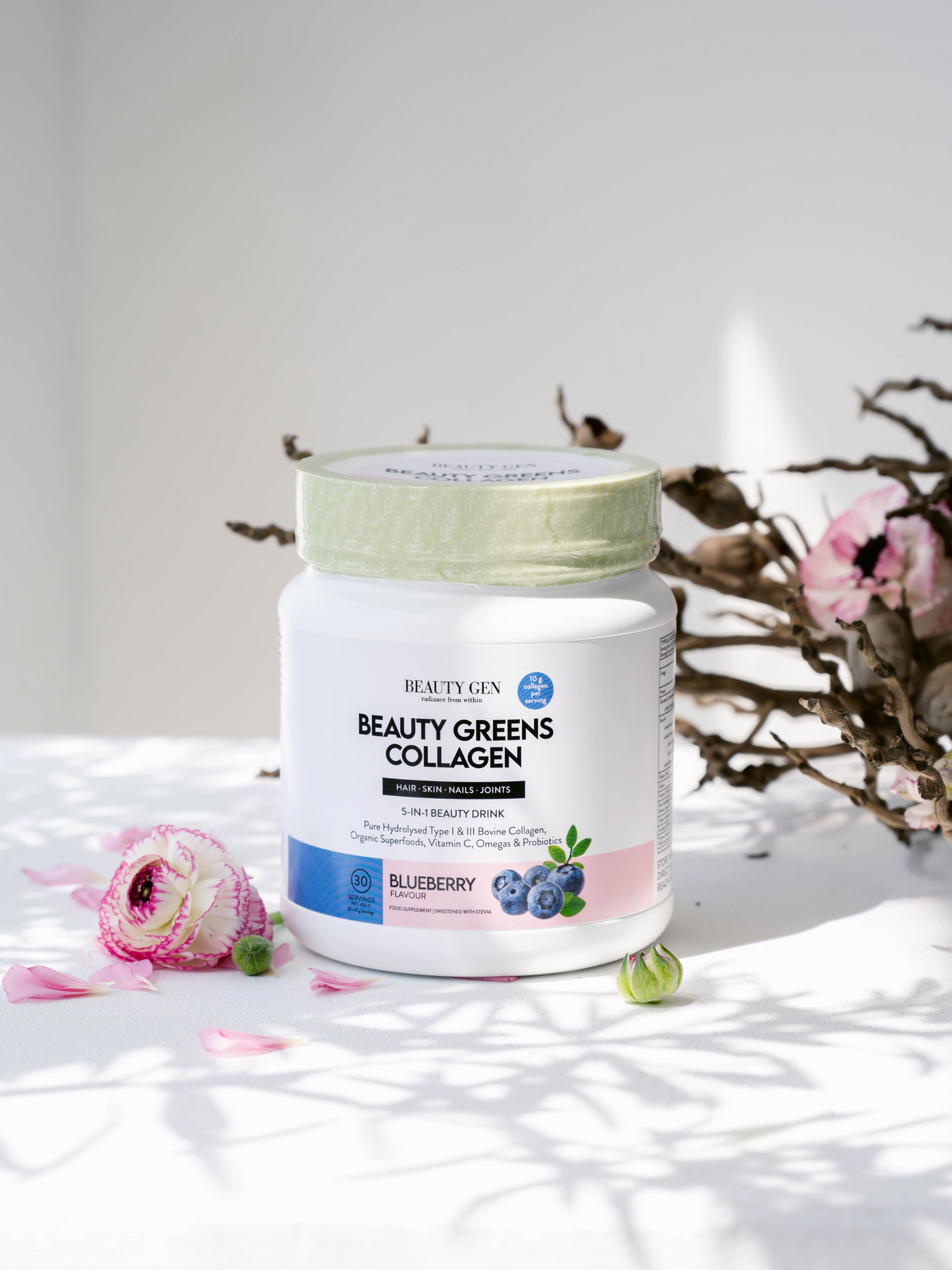 These flagship Beauty Greens products are an effective 5-in-1 collagen beauty supplement enriched with pure hydrolysed type I and III collagen, dairy-free probiotics, omega-3s, 50 organic superfoods and buffered vitamin C.