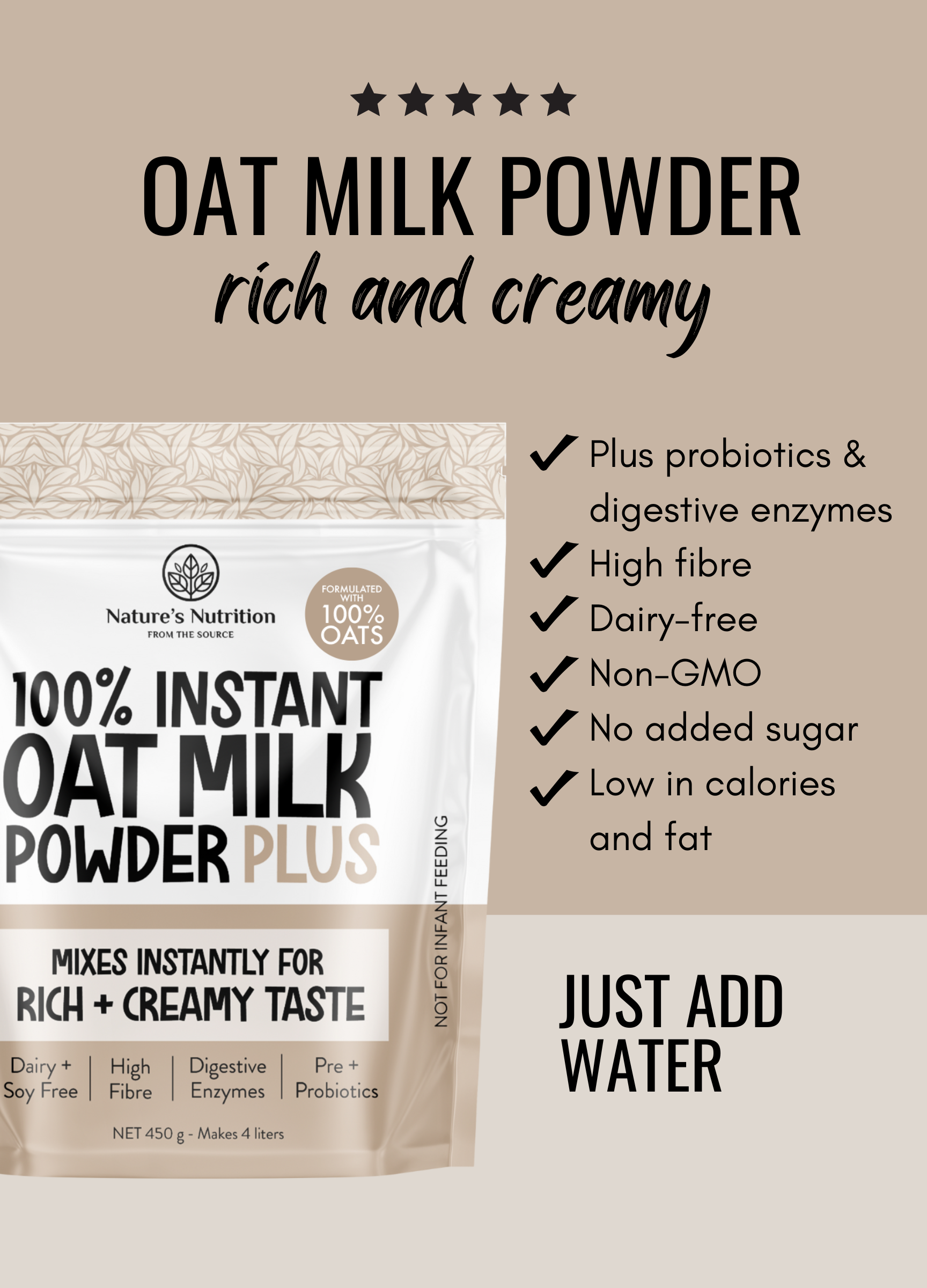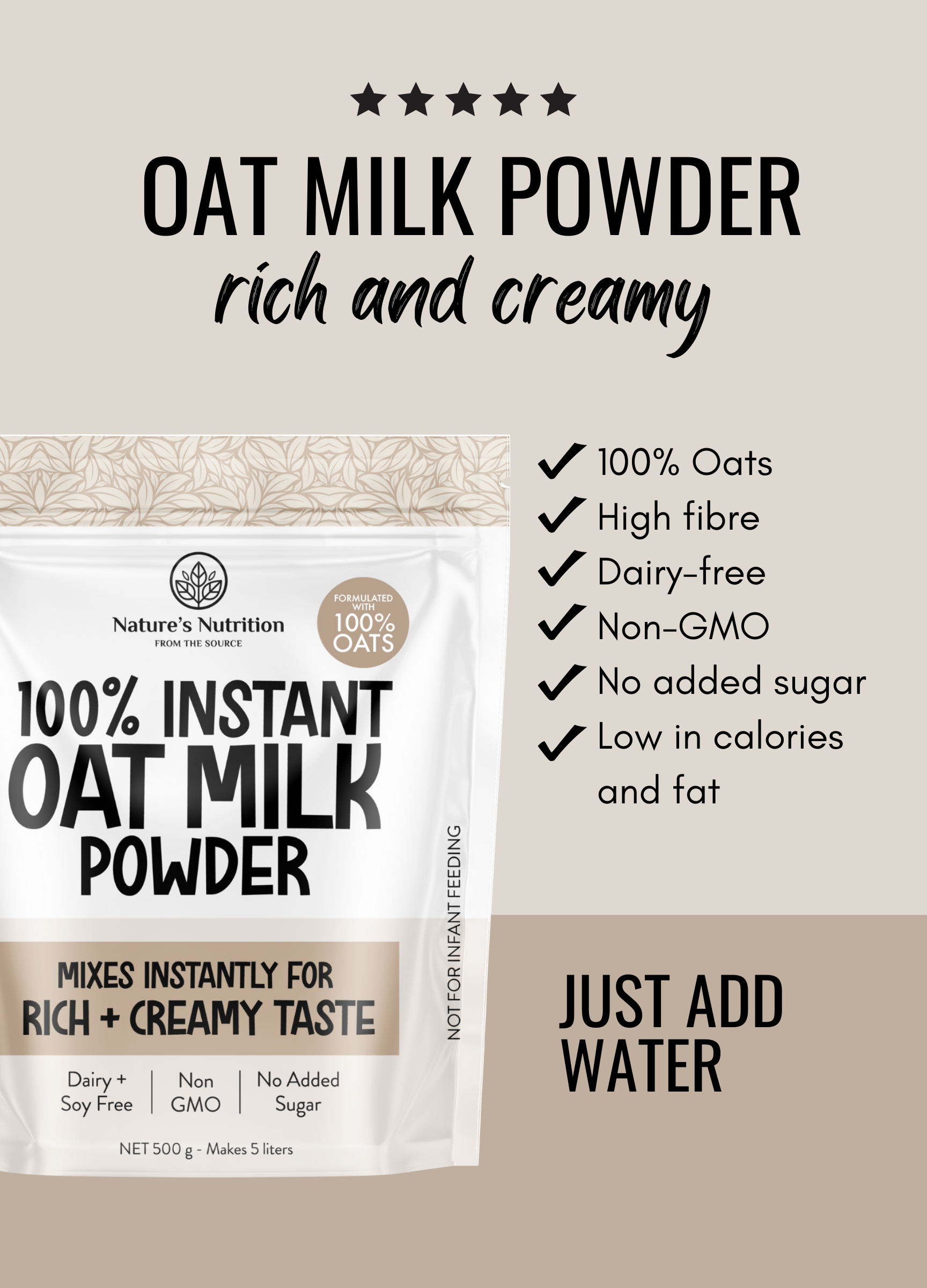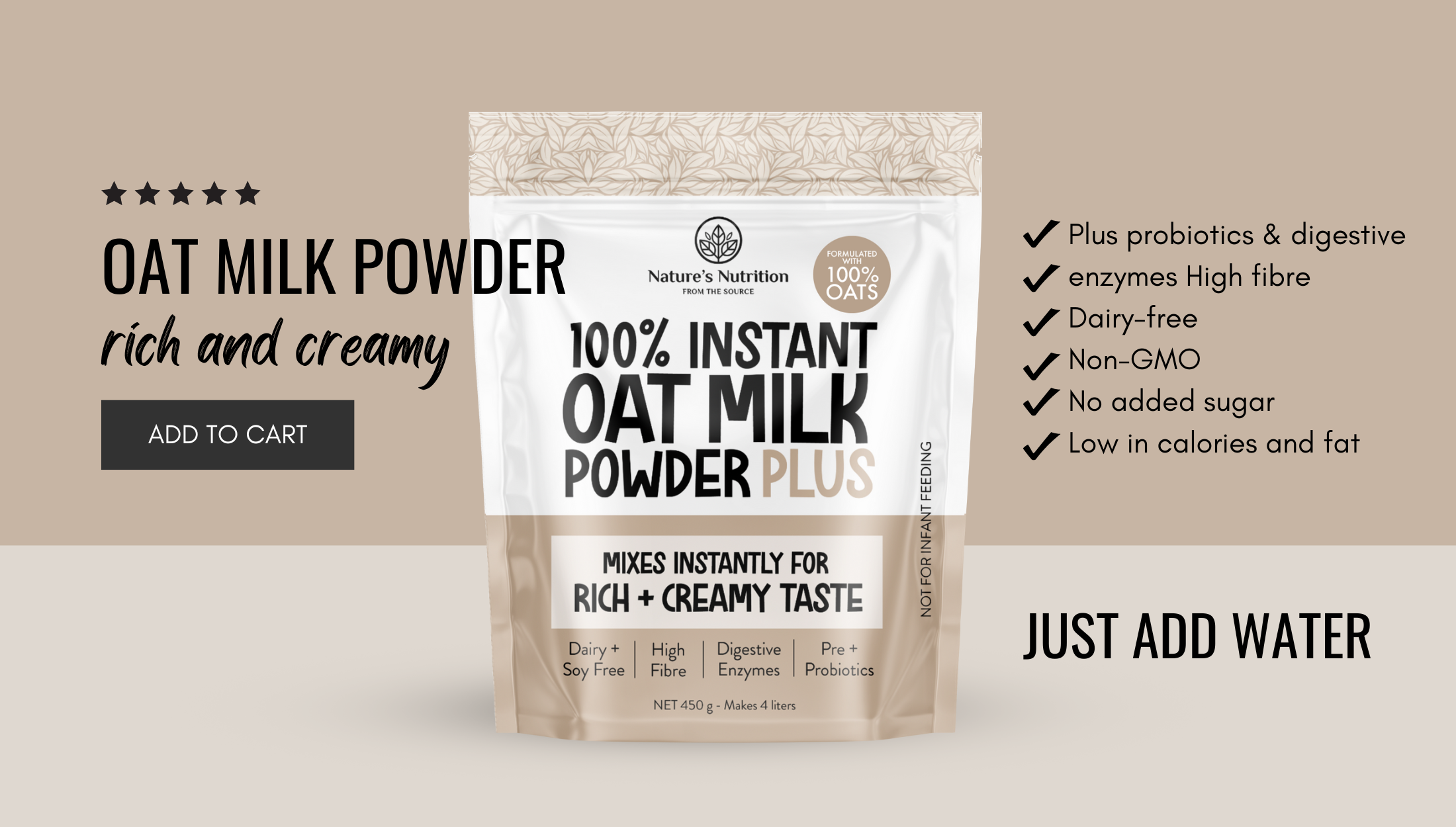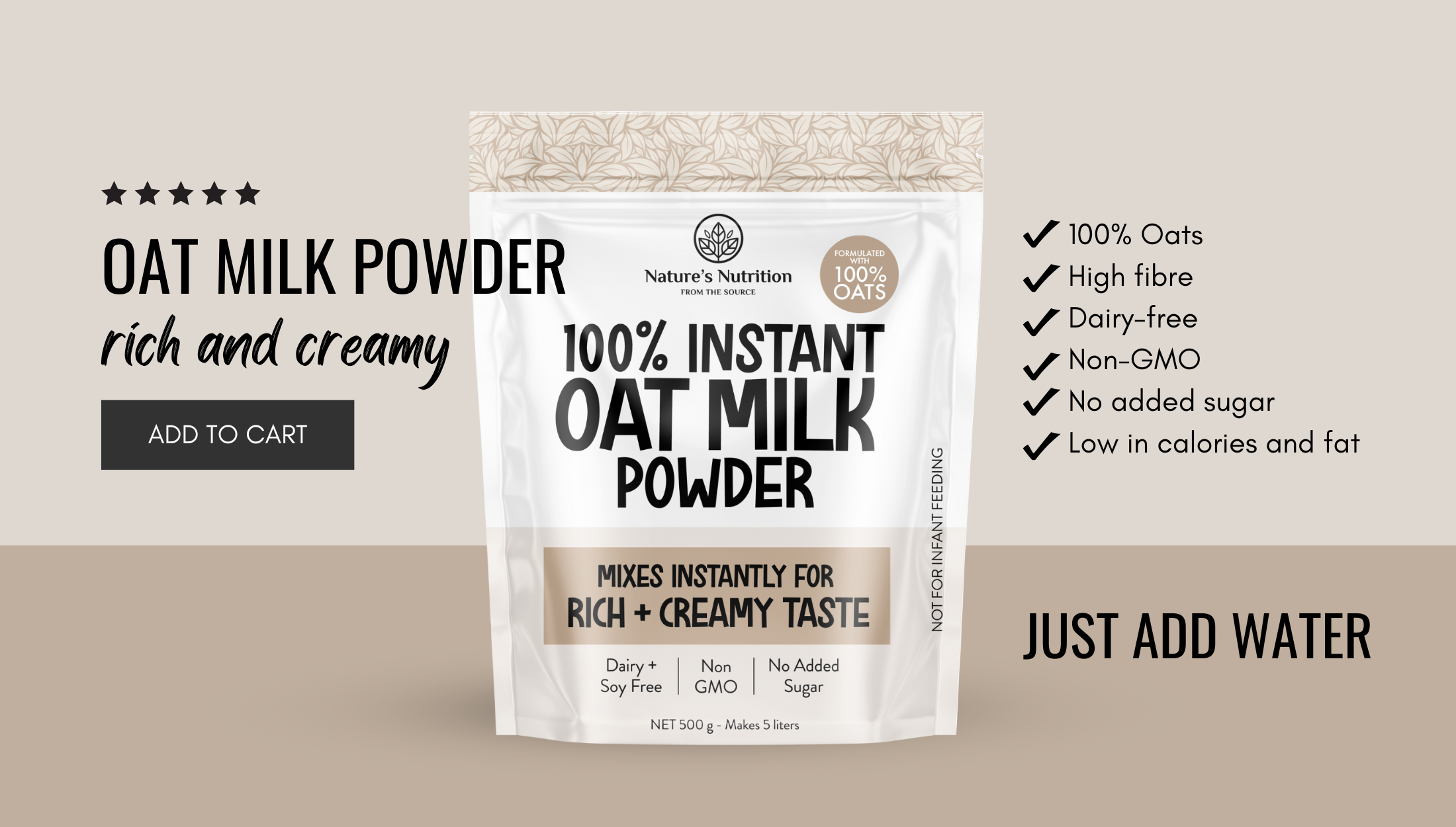 Our Instant Oat Milk Powder is a great plant-based milk alternative. Add it directly to smoothies or to hot drinks as a creamer, or use diluted with water to soak overnight oats, use in a white sauce, or include in other recipes that call for milk. Follow us on Facebook and Instagram for regular healthy and delicious recipe ideas.