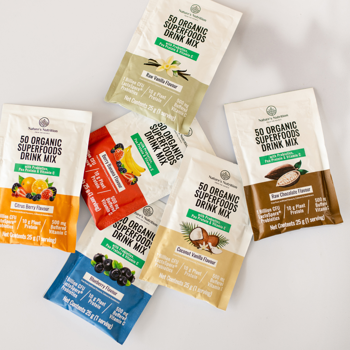 Our Nature’s Nutrition formulations provide a good supply of plant protein, vitamin C, probiotics, organic superfoods and fibre and, being low in fat and calories, our drink mixes can be used as a snack or meal replacement to support the nutritional requirements of an active healthy lifestyle. We do, however, advise against using our products as a sole source of nutrition and rather including them as part of a balanced daily eating plan.